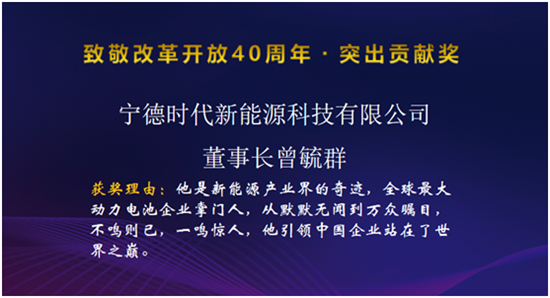 頒獎詞:他是新能源產業界的奇跡,全球最大動力電池企業掌門人,從默默無聞到萬眾矚目,不鳴則已,一鳴驚人,他引領中國企業站在了世界之巔。