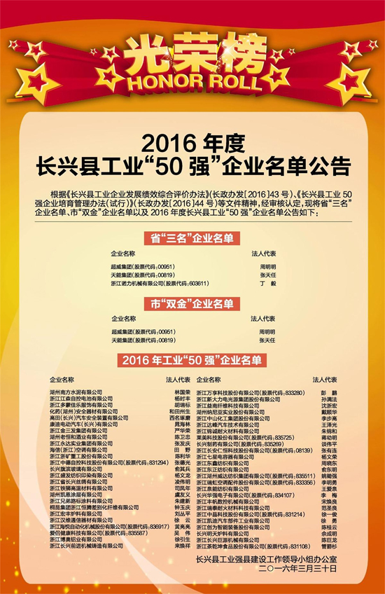 3月30日,浙江省長興縣工業(yè)強(qiáng)縣建設(shè)工作領(lǐng)導(dǎo)小組辦公室發(fā)布了《2016年度長興縣工業(yè)“50強(qiáng)”企業(yè)名單》,超威入選省三名試點(diǎn)企業(yè)、市雙金企業(yè)名單,成為全縣工業(yè)企業(yè)中實(shí)至名歸的排頭兵、領(lǐng)頭羊。