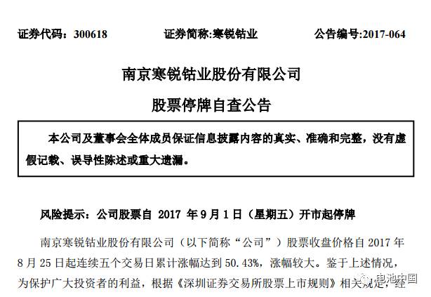 寒銳鈷業(yè)8月31日發(fā)布公告稱,公司股票價(jià)格自8月25日起,五個(gè)交易日連收4個(gè)漲停板,累計(jì)漲幅達(dá)50.43%,公司股票9月1日起停牌核查,預(yù)計(jì)停牌時(shí)間不超過三個(gè)交易日。