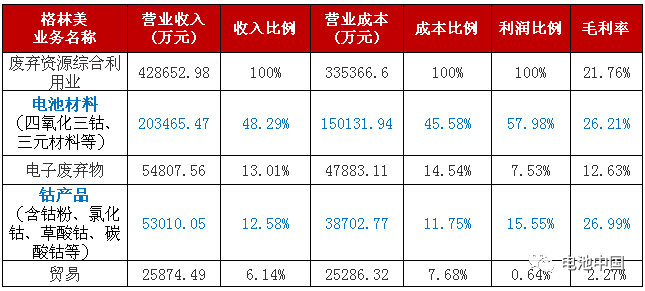 2017年上半年,格林美營業(yè)收入42.87億元,同比增長30.46%;上半年凈利潤2.73億元,同比增長58.60%。在格林美的廢棄資源綜合利用業(yè)務(wù)中,電池材料(四氧化三鈷、三元材料等)和鈷產(chǎn)品(含鈷粉、氯化鈷、草酸鈷、碳酸鈷等)占較大比重,這兩項(xiàng)營業(yè)收入達(dá)25.65億元,占總收入的60.87%,其中,前者的毛利率26.21%,后者的毛利率為26.99%。