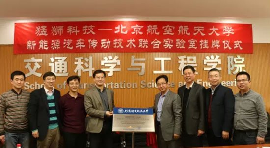 2016年3月11日下午,廣東猛獅新能源科技股份有限公司(以下簡稱“猛獅科技”)與北京航空航天大學(xué)交通科學(xué)與工程學(xué)院(以下簡稱“北航交通學(xué)院”)聯(lián)合成立的新能源汽車傳動技術(shù)聯(lián)合實驗室在北京航空航天大學(xué)工程訓(xùn)練中心舉行了掛牌儀式。