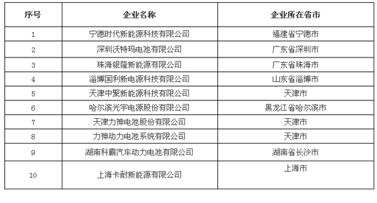2015年11月11日,工信部于其官方網站發布了符合《汽車動力蓄電池行業規范條件》企業名單(第一批),共有10家企業上榜,如下:
