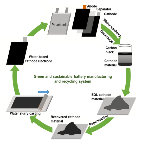 研究人員發(fā)現(xiàn),通過(guò)水基工藝制造的電極與傳統(tǒng)基于溶劑工藝制造的電極的速率性能和循環(huán)壽命相當(dāng)。利用水溶性粘合劑能夠利用水,從廢電極中回收陰極化合物,成功再生此類化合物后,新電極與原始電極電化學(xué)性能相當(dāng)。