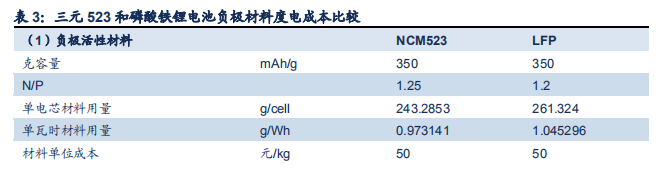 負極材料包括負極活性材料、負極粘合劑、負極集流體(銅箔)和負極組件負極端子。據我們測算,目前三元 523 負極活性材料、粘合劑、銅箔、負極端子度電成本分別為 48.66、0.99、41.37、19.32 元/kWh,磷酸鐵鋰電池分別為 52.27、1.07、45.81、19.54 元/kWh,負極材料中活性材料、銅箔和負極端子成本占比較高,粘合劑占比較低。考慮到材料損耗,我們測算得出三元 523 負極材料度電總成本為 122.59 元/kWh,磷酸鐵鋰負極材料度電總成本為 131.87 元/ kWh。由于能量密度的不同以及其他材料接近的原因,磷酸鐵鋰電池的負極材料成本高于三元電池。