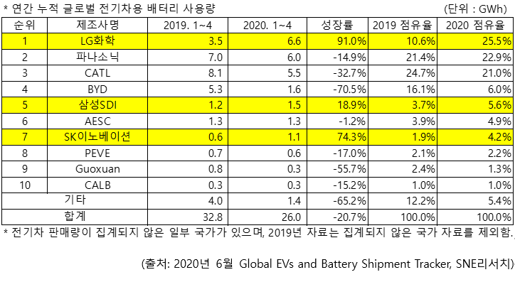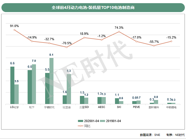 在特斯拉有意與多家供應商合作后,松下的優勢就被吞噬。今年它的累計量位居第二,與去年同期相比下降了14.9%。國內電池廠,比較讓人意外的是AESC和中航鋰電,下降速度低于市場平均水平。中航鋰電從3月份開始進入全球動力電池裝機量的TOP10。LG化學同比增長91.0%至6.6 GWh,從去年同期的第四位躍居第一。三星SDI裝機量為1.5GWh,增長了18.9%,名次上升五位。SKI上漲74.3%至1.1GWh,上升兩個名次。三家公司的增長歸功于配套車型的銷量增長。LG化學綁定的特斯拉國產Model 3和奧迪e- tron EV 銷量強勁,導致裝機量激增。奧迪e-tron前4個月售出1.25萬輛,是TOP10全球新能源汽車。