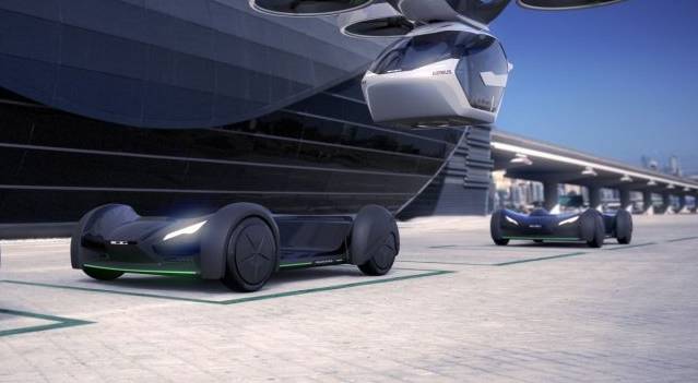 與地面模塊相對應(yīng)的飛行模塊,則是由一架直徑為4.4米,4個旋翼的無人機(jī)操控,無人機(jī)的輪子旋轉(zhuǎn)產(chǎn)生巨大的升力,中間的凹槽固定駕駛艙車身,可垂直起降。無可通過AI平臺和手機(jī)APP控制,空中推進(jìn)模塊采取電力驅(qū)動。