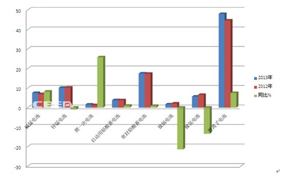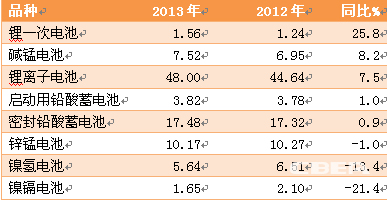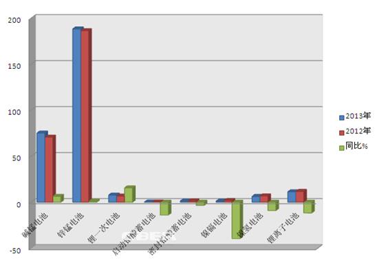 2013年,我國化學電源主要品種出口額同比上年增長3.2%,總計95.8億美元,2012年出口額為92.8億美元。
