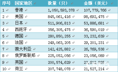2013年,我國圓柱堿錳電池出口的前十大國家和地區(qū)分別為香港、美國、日本、西班牙、德國、法國、澳大利亞、俄羅斯聯(lián)邦、英國和荷蘭。其中,向香港地區(qū)的出口量和金額均排名第一,出口量為1,050,593,378只,出口金額為107,779,766美元。