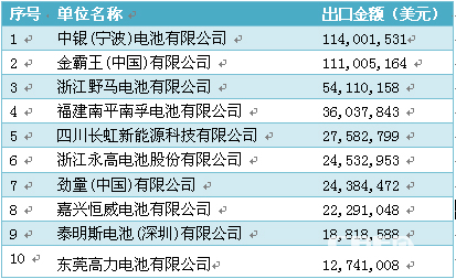 2013年,我國圓柱堿錳電池前十大出口企業(yè)分別為中銀(寧波)電池有限公司、金霸王(中國)有限公司、浙江野馬電池有限公司、福建南平南孚電池有限公司、四川長虹新能源科技有限公司、浙江永高電池股份有限公司、勁量(中國)有限公司、嘉興恒威電池有限公司、泰明斯電池(深圳)有限公司、東莞高力電池有限公司,這十大企業(yè)共實現(xiàn)出口金額445,505,564美元。