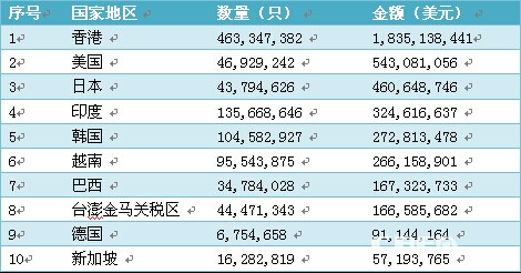 2013年,我國鋰離子電池出口的前十大國家和地區(qū)中,出口香港地區(qū)的總量和金額均排名第一,出口量達(dá)到了463,347,382只,出口總金額達(dá)到1,835,138,441美元。