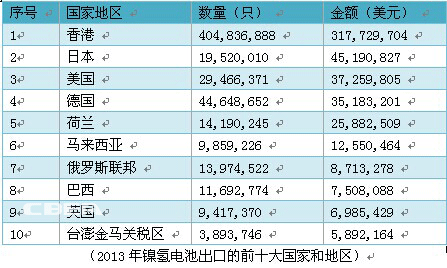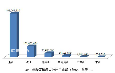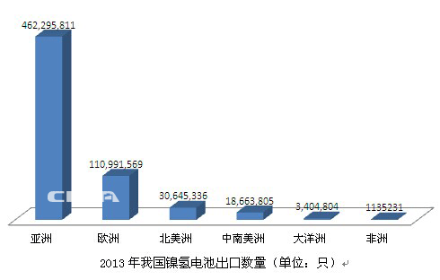 據(jù)中國化學與物理電源行業(yè)協(xié)會發(fā)布的《2013年我國電池產(chǎn)業(yè)出口數(shù)據(jù)》,2013年我國鎳氫電池的出口量為6.27億只,2012年出口量為6.9億只,同比減少9.1%。2013年,我國鎳氫電池出口額為5.64億美元,而2012年出口額為6.51億美元,同比減少13.4%。其中,出口亞洲金額同比減少14.2%,出口歐洲金額同比減少8.6%,出口北美金額同比減少19.7%。出口中南美洲金額同比減少2.5%。