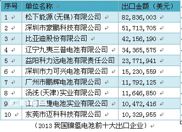 2013年,松下能源(無錫)有限公司、深圳市豪鵬科技有限公司、比亞迪股份有限公司等企業(yè)鎳氫電池出口量排在前三位,其中,排名首位的松下能源(無錫)有限公司出口額達到了82,836,003美元。