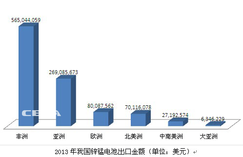據中國化學與物理電源行業協會發布的《2013年我國電池產業出口數據》,2013年,我國鋅錳電池出口量為188.39億只,2012年出口量為186.49億只,出口量同比增長1.01%。2013年鋅錳電池出口額為10.17億美元,2012年出口額為10.27億美元,同比減少0.97%。其中,出口非洲金額同比增長7.4%,出口亞洲同比減少15.9%。出口歐洲同比減少4.4%,出口北美同比增長8.2%。