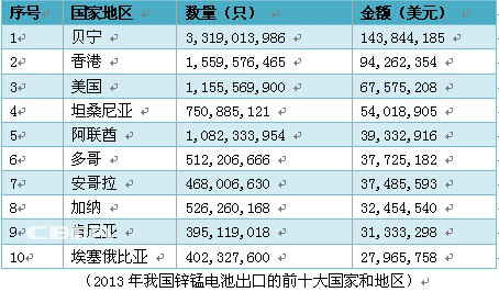 2013年,我國鋅錳電池出口的前十大國家和地區分別為貝寧、香港、美國、坦桑尼亞、阿聯酋、多哥、安哥拉、加納、肯尼亞、埃塞俄比亞。其中,共出口貝寧共和國3,319,013,986只鋅錳電池,出口金額143,844,185美元。
