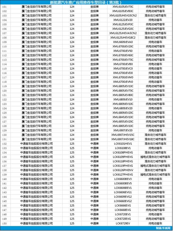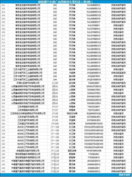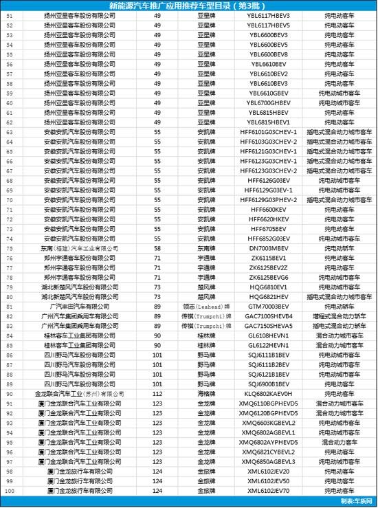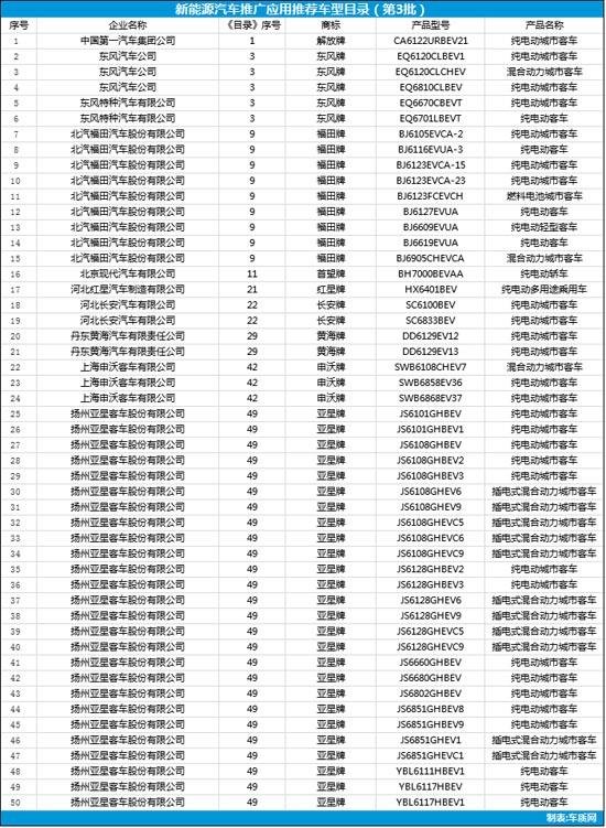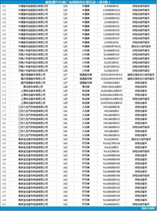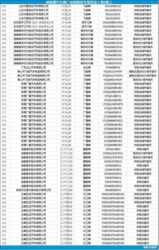 工信部網(wǎng)站4月1日發(fā)布道路機(jī)動車輛生產(chǎn)企業(yè)及產(chǎn)品(第282批)和《新能源汽車推廣應(yīng)用推薦車型目錄》(第3批)。共有309款車型入選第3批新能源汽車推廣應(yīng)用推薦目錄,其中以純電動客車為主。