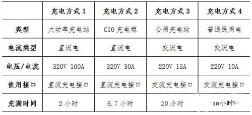 表1 比亞迪e6的主要充電方式 (注:55千瓦時電池充滿后可提供300公里的綜合工況續航里程)