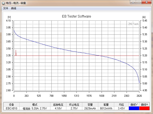 可以看到即使是2C(5.2A)大電流放電,力神2600的容量依然達(dá)到2600mAh以上,且與1C容量相差無幾,證明力神2600的大電流放電性能十分優(yōu)異。
