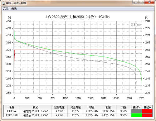 再對比一下LG 2600和力神2600的1C(2.6A)放電曲線。可以發(fā)現(xiàn),力神2600的放電性能完全不遜色于LG 2600mAh 18650,甚至還顯著高于LG 2600。得益于力神的電壓平臺(tái)更高,雖然都是2600mAh,但能量明顯要高于LG。