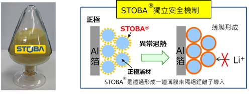 高安全電池材料 STOBA 是一種納米級樹枝狀結(jié)構(gòu)的高分子化合物,當(dāng)鋰電池發(fā)生異常,產(chǎn)生高溫時,會形成一道薄膜阻隔鋰離子間的流動,穩(wěn)定鋰電池,藉以提高電池安全度。在臺灣已有 E-bike、電動摩托車及智能手機(jī)等產(chǎn)品應(yīng)用高安全電池材料 STOBA 在其電池產(chǎn)品。