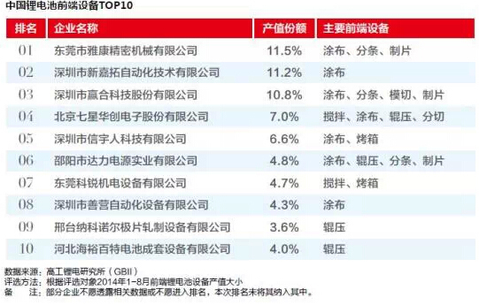 高工鋰電產(chǎn)業(yè)研究所(GBII)經(jīng)過詳細(xì)深入調(diào)研,評選出2014年中國鋰電池前端設(shè)備TOP10企業(yè),以期對讀者有所裨益。