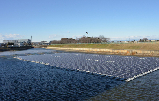 日本埼玉縣桶川市當地水庫內,目前已建設完成的水上太陽能發電站。12400平方米的水面上漂浮著4500塊太陽能電池板,而水面面積達3萬平方米的水庫,及其周邊河流充足的水源,都擁有良好的冷卻效果。