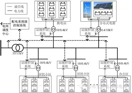 電動(dòng)汽車和分布式電源是未來智能配電網(wǎng)中必不可少的負(fù)荷和電源,如何對(duì)這些元件進(jìn)行合理的調(diào)度是一個(gè)至關(guān)重要的研究課題。鑒于上述研究中的不足及研究思路,本文提出一種分層有序充電控制架構(gòu),在配電網(wǎng)建立兩層控制系統(tǒng):配電系統(tǒng)控制系統(tǒng)和站級(jí)控制系統(tǒng),給出了相應(yīng)的控制模型,能夠在與傳統(tǒng)電網(wǎng)控制架構(gòu)融合的基礎(chǔ)上,實(shí)現(xiàn)配電網(wǎng)范圍內(nèi)電動(dòng)汽車與分布式可再生電源的協(xié)同有序控制。