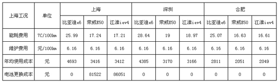注:上海市充電電價為0.617元/kWh,深圳市充電電價為0.68元/kWh,合肥市充電電價為0.5953元/kWh。上海市消費者日均行駛里程為40km,年均行駛14400km (假設每年行駛360天);深圳市消費者日均行駛里程為35km,年均行駛12600km;合肥市消費者日均行駛里程為25km,年均行駛9000km。在車輛維護費用方面,主要包括車輛維護保養費、車輛維修費、保險費、養路費等,純電動汽車年檢保養費用約為每l00km/6.16元,普通車輛為每l00km/14元;在電池更換成本方面,本文取電池循環充電次數為2000次。