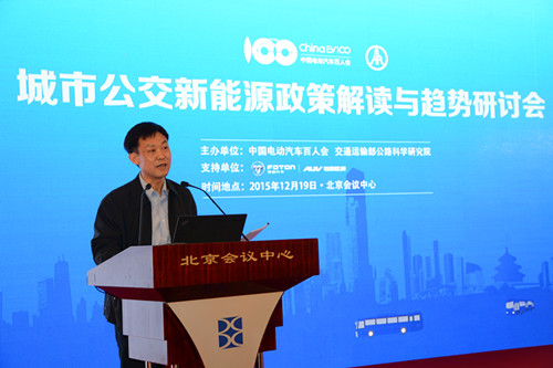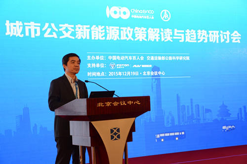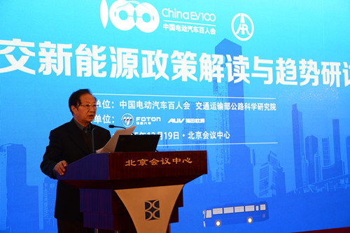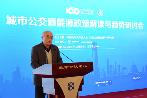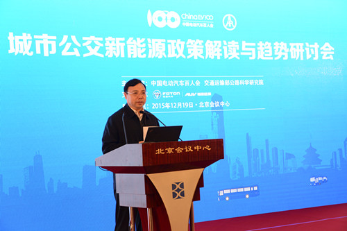 2015年12月19日,由中國電動汽車百人會與交通運輸部公路科學研究院聯(lián)合舉辦的“城市公交新能源政策解讀與趨勢研討會”在北京召開,國務院發(fā)展研究中心原黨組書記陳清泰、交通運輸部運輸服務司副司長王水平、工業(yè)和信息化部裝備工業(yè)司副巡視員瞿國春、中國道路運輸協(xié)會城市客運分會理事長張國光、中國電動汽車百人會執(zhí)行副理事長歐陽明高等參加會議并講話。